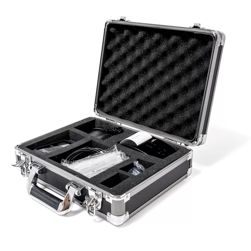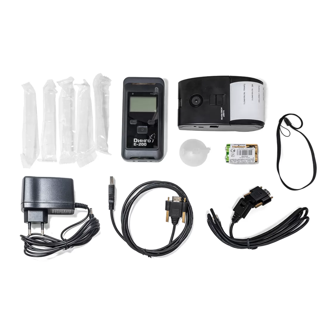 Алкотестер, батарейки АА-2 шт., мундштуки.-5 шт., мундштук – воронка, кейс, кабель для ПК, термопринтер |