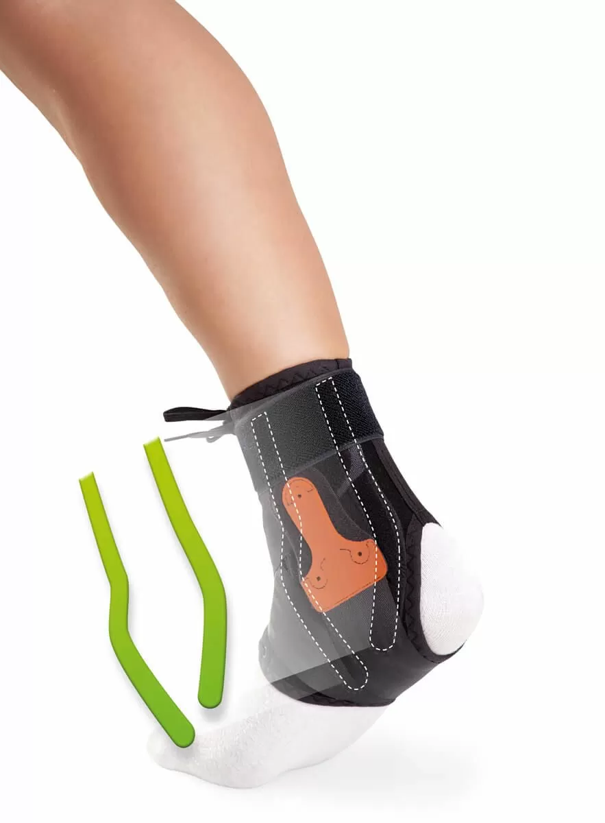 - Ортез оснащен медиальными и латеральными боковыми вставками (по две с каждой стороны), которые обеспечивают боковую стабилизацию голеностопа при этом оставляя свободными движения сгибания-разгибания.