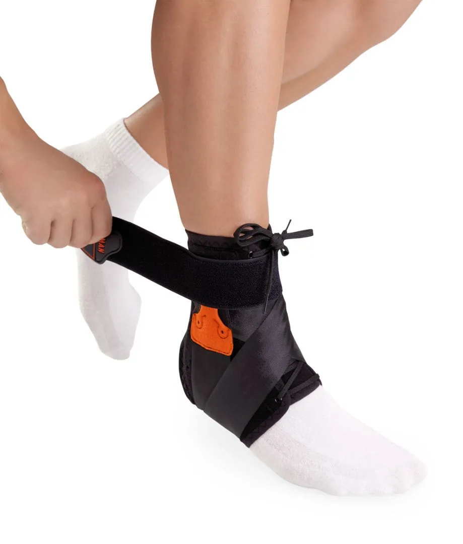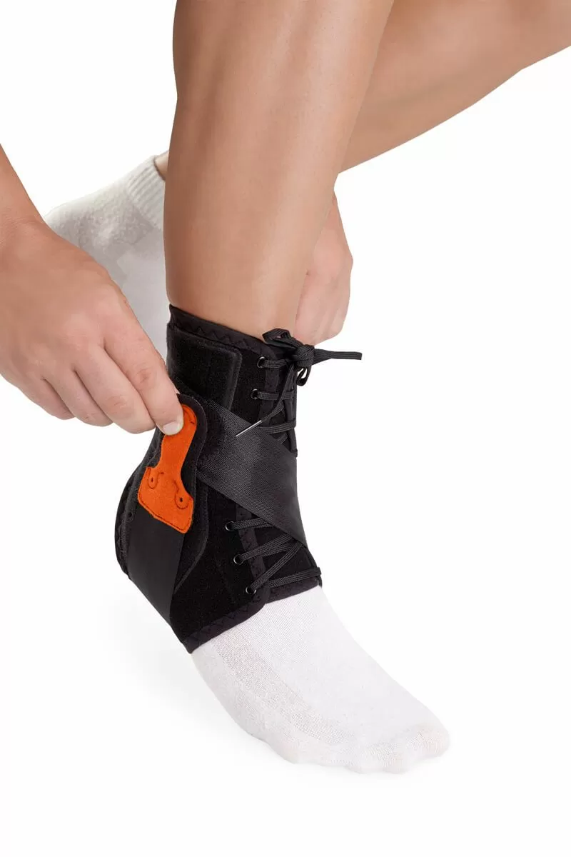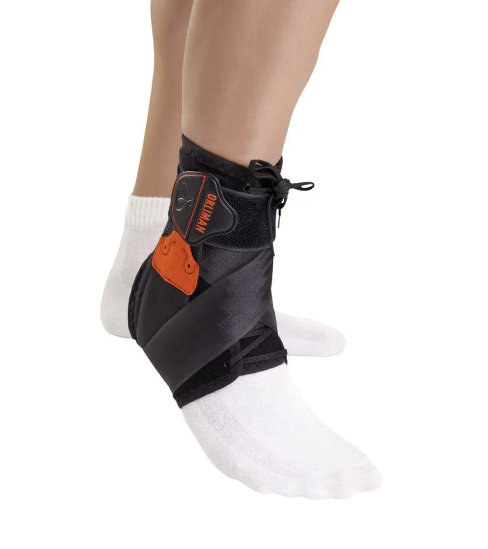 - Двойная система шнуровки: верхняя часть классическая, нижняя — на липучке, что позволяет быстро надеть и подогнать ортез.