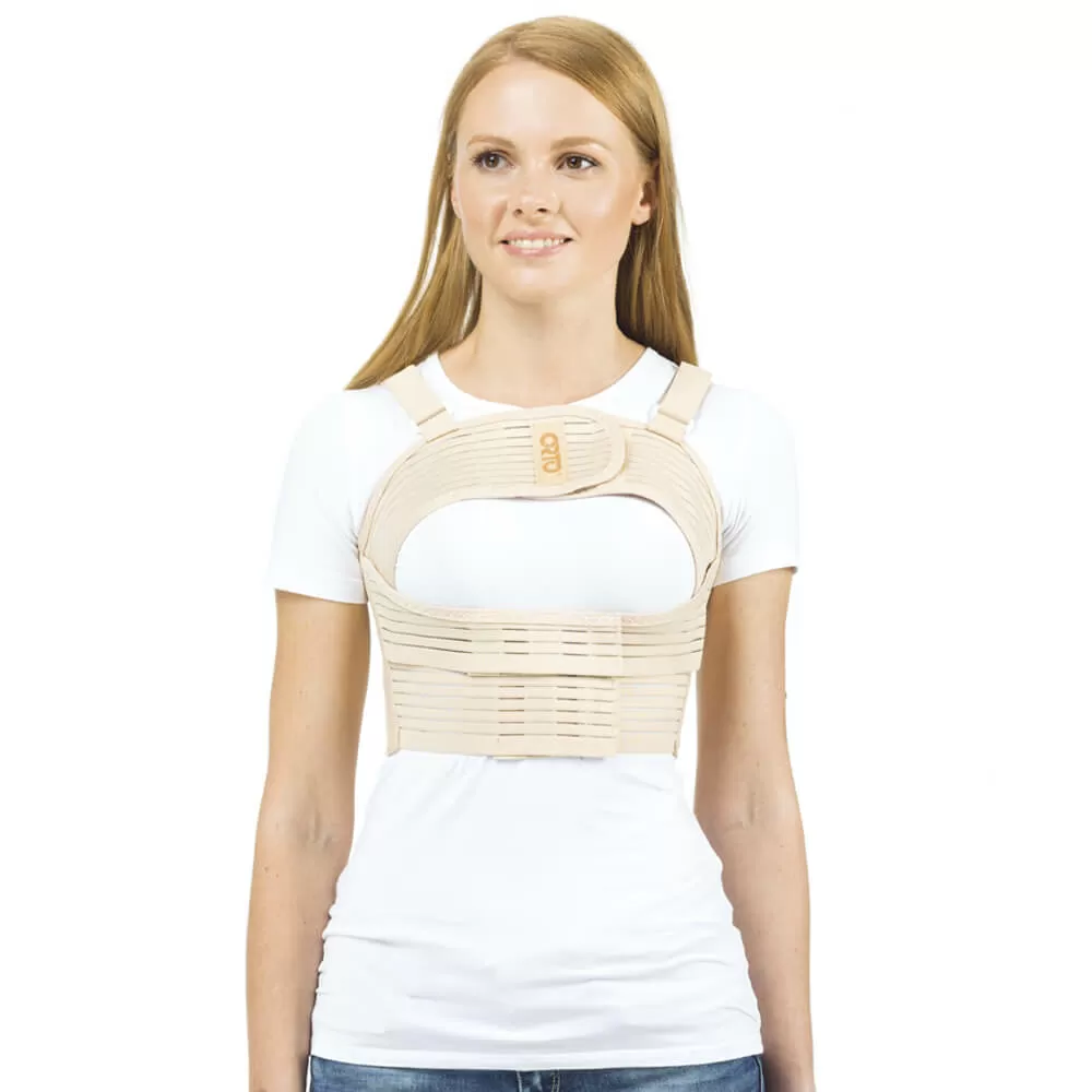 Торакальный ортез с разъемной эластичной основой сложной анатомической формы, адаптированной под женский тип грудной клетки. Разработан по технологии AirPlus: основа изделия изготовлена из эластичного материала разреженной вязки, застежка «Велкро» имеет дискретную конструкцию, гибкие планшетки в боковой части основы и в креплениях предотвращают скручивание. Боковые части основы имеют по три панели (две нижние и одну верхнюю). Дополнительная фиксация ортеза осуществляется с помощью эластичных регулируемых лямок с застежкой «Велкро», длина лямок регулируется за счет изменения уровня фиксации застежки. Высота в центральной части основы 16 см.