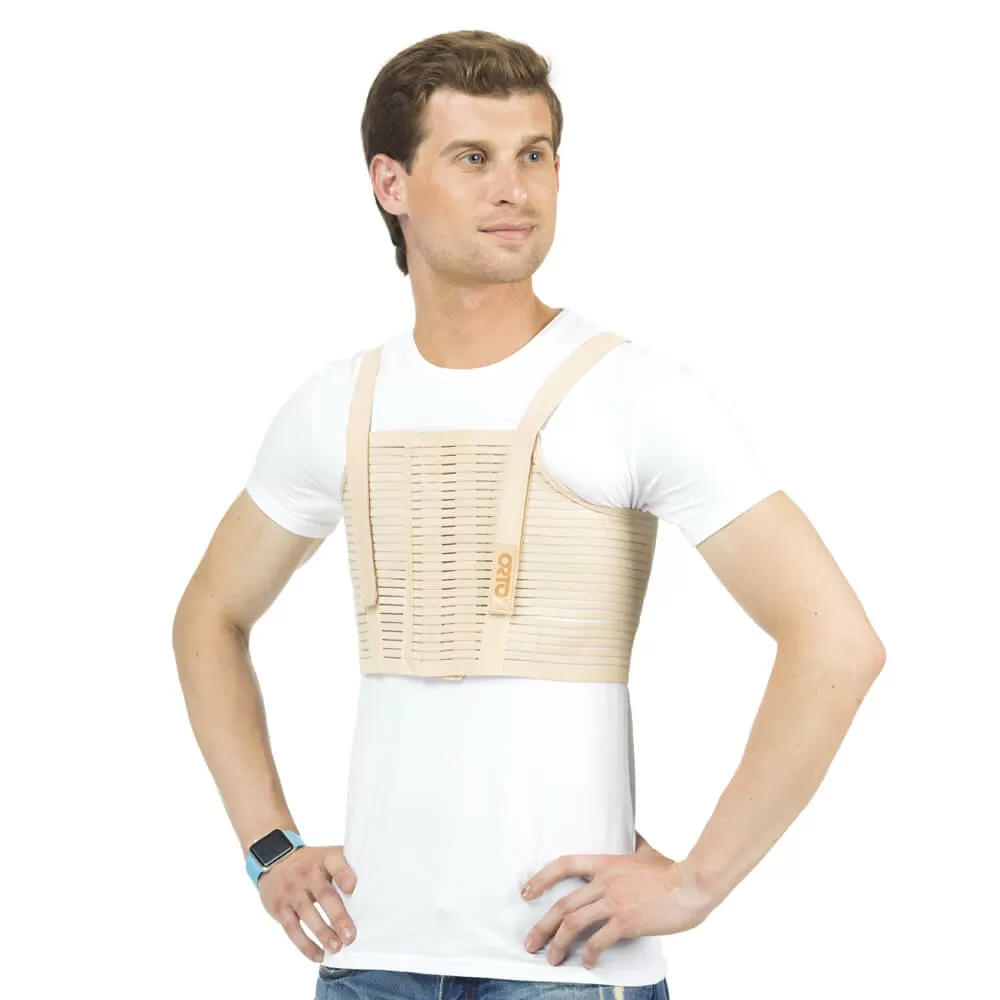 Торакальный ортез с разъемной основой анатомической формы, адаптированной под мужской тип грудной клетки. Разработан по технологии AirPlus: основа изделия изготовлена из эластичного материала разреженной вязки, застежка «Велкро» имеет дискретную конструкцию, гибкие планшетки в боковой части основы и в креплениях предотвращают скручивание. Дополнительная фиксация ортеза осуществляется с помощью эластичных лямок с застежкой «Велкро», длина лямок регулируется за счет изменения уровня фиксации застежки. Высота основы — 24 см.