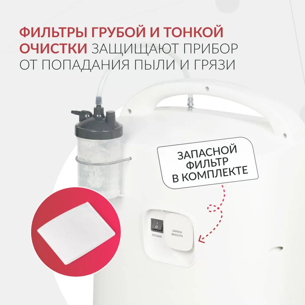 - Система фильтрации. Концентратор кислорода оснащён фильтрами грубой и тонкой очистки. Фильтр грубой очистки расположен в боковой части корпуса и предохраняет прибор от попадания пыли и крупных частиц грязи. Фильтр тонкой очистки находится в задней части корпуса и защищает от посторонних микрочастиц. Фильтры защищены от повреждений пластиковыми крышками, просты в уходе и замене. В комплекте поставляется запасной фильтр грубой очистки.