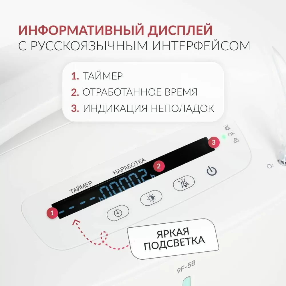 - Удобное управление. На цифровом дисплее отображается отработанное время в часах, таймер, а также индикаторы, обозначающие статус работы прибора. По ним можно узнать, обеспечивается ли достаточная концентрация кислорода в кислородно-воздушной смеси, а также вовремя определить неисправности системы. На панели управления под дисплеем расположены кнопки, позволяющие включить прибор, настроить таймер, подсветку дисплея и звуковое оповещение.