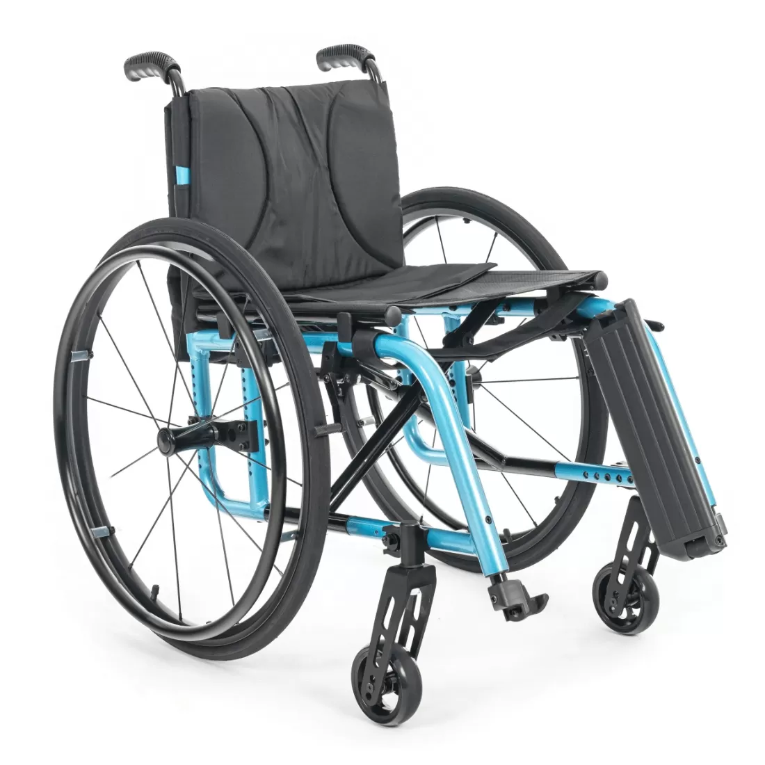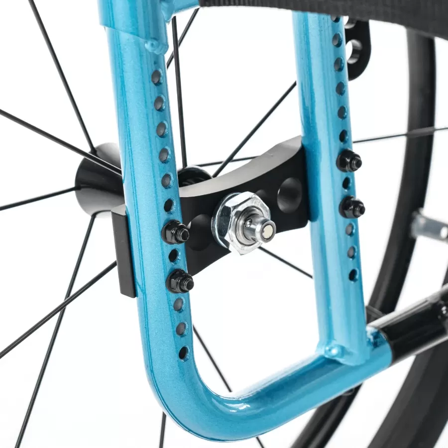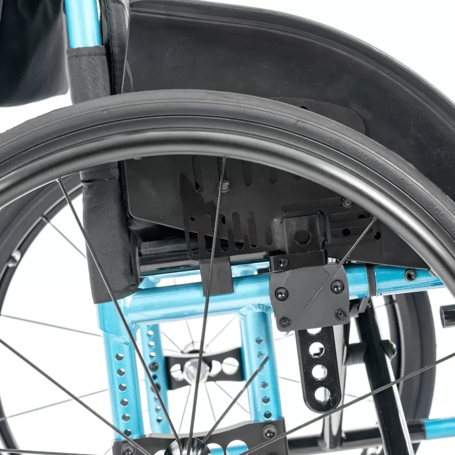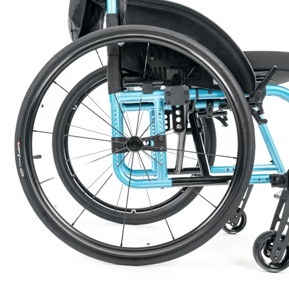 - Приводные быстросъёмные колёса оснащены фрезерованными втулками с закрытыми спицевыми люверсами, профессиональной пневматической резиной и стояночными тормозами-фиксаторами