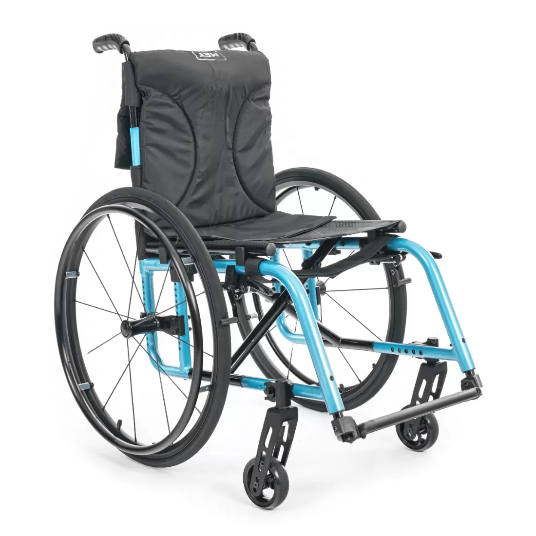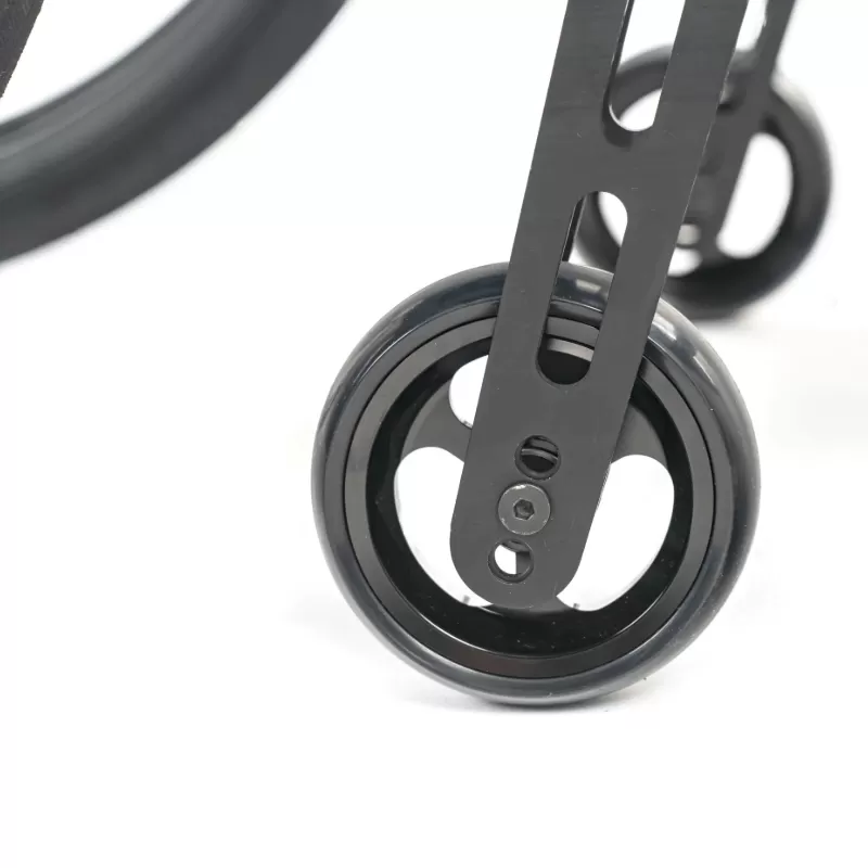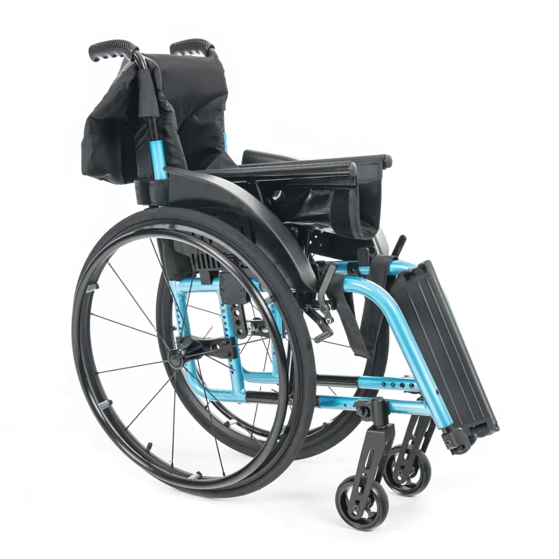 - Приводные быстросъёмные колёса оснащены фрезерованными втулками с закрытыми спицевыми люверсами, профессиональной пневматической резиной и стояночными тормозами-фиксаторами