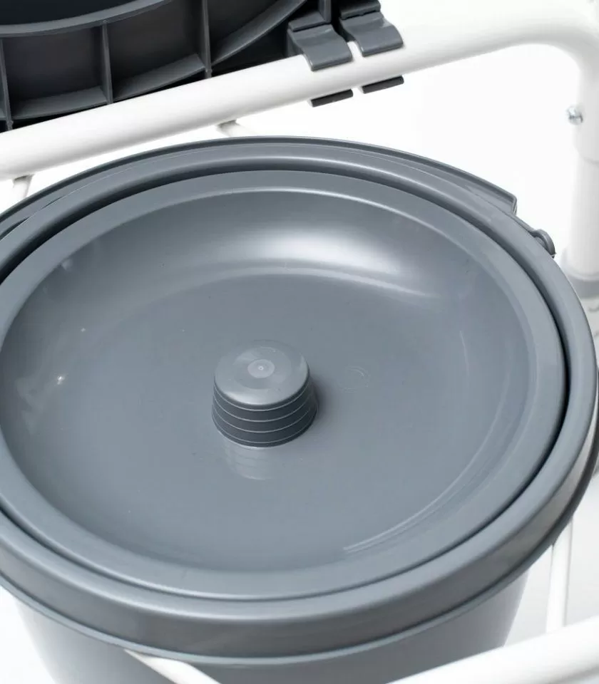 - Модель оснащена съемным ведром с крышкой и пластиковыми подлокотниками.