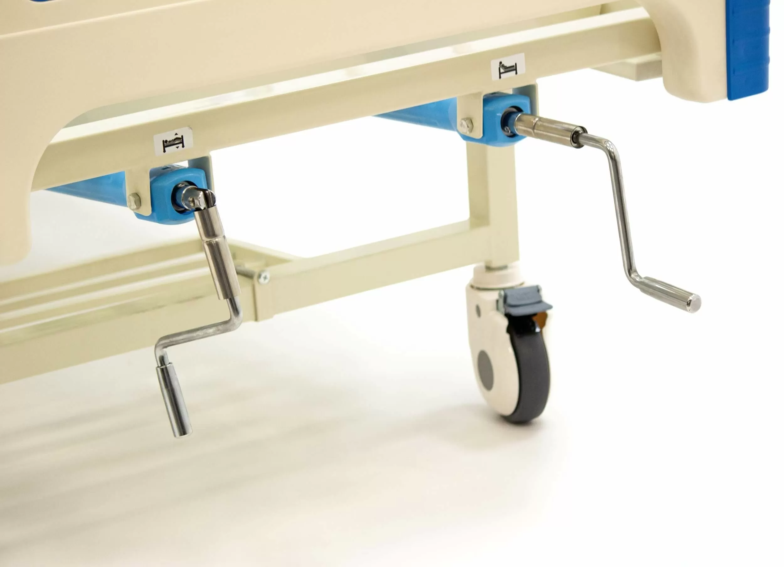Выдвижные регуляторы положения ложа расположены в ножной части кровати, что позволяет персоналу легко регулировать положение ложа.