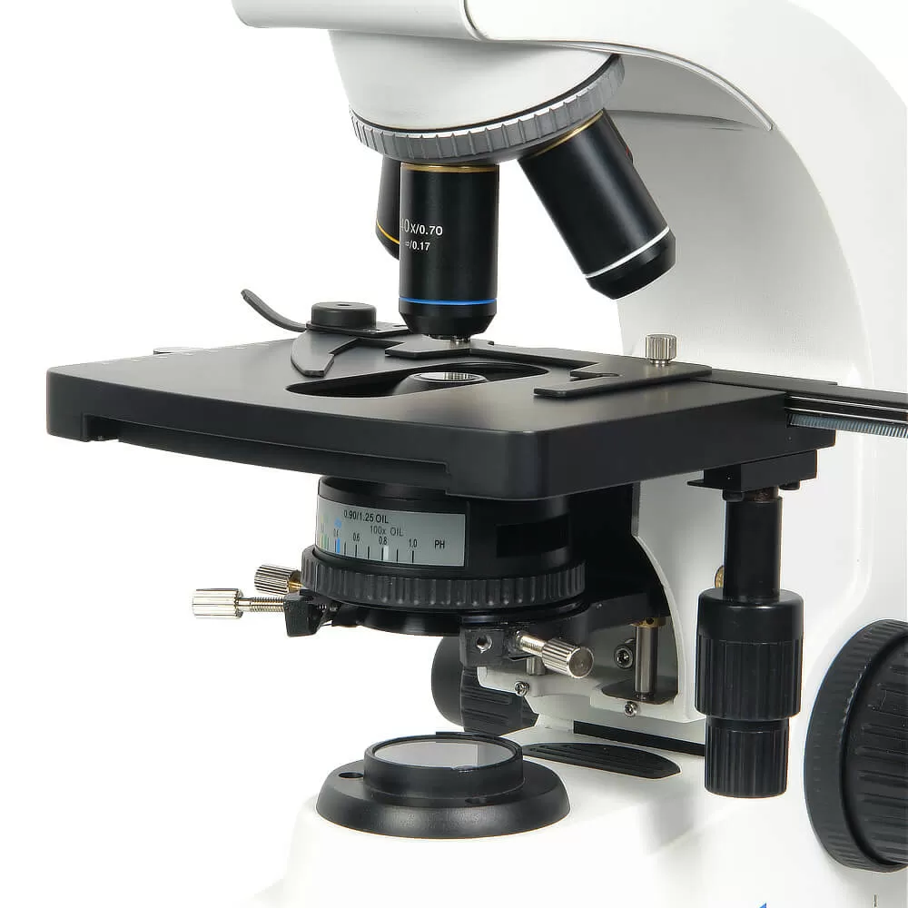 - В комплекте микроскопа объективы с коррекцией на бесконечность 4x/0.13, 10x/0.30, 40x/0.70 и иммерсионный объектив 100x/1.25 oil. По дополнительному заказу может быть приобретен объектив 60х/0.80. Высокое оптическое качество объективов обеспечивает информативность и комфорт при исследованиях и отличное качество записываемых изображений. Объективы стандартизованы по DIN и имеют парфокальную высоту 45 мм.