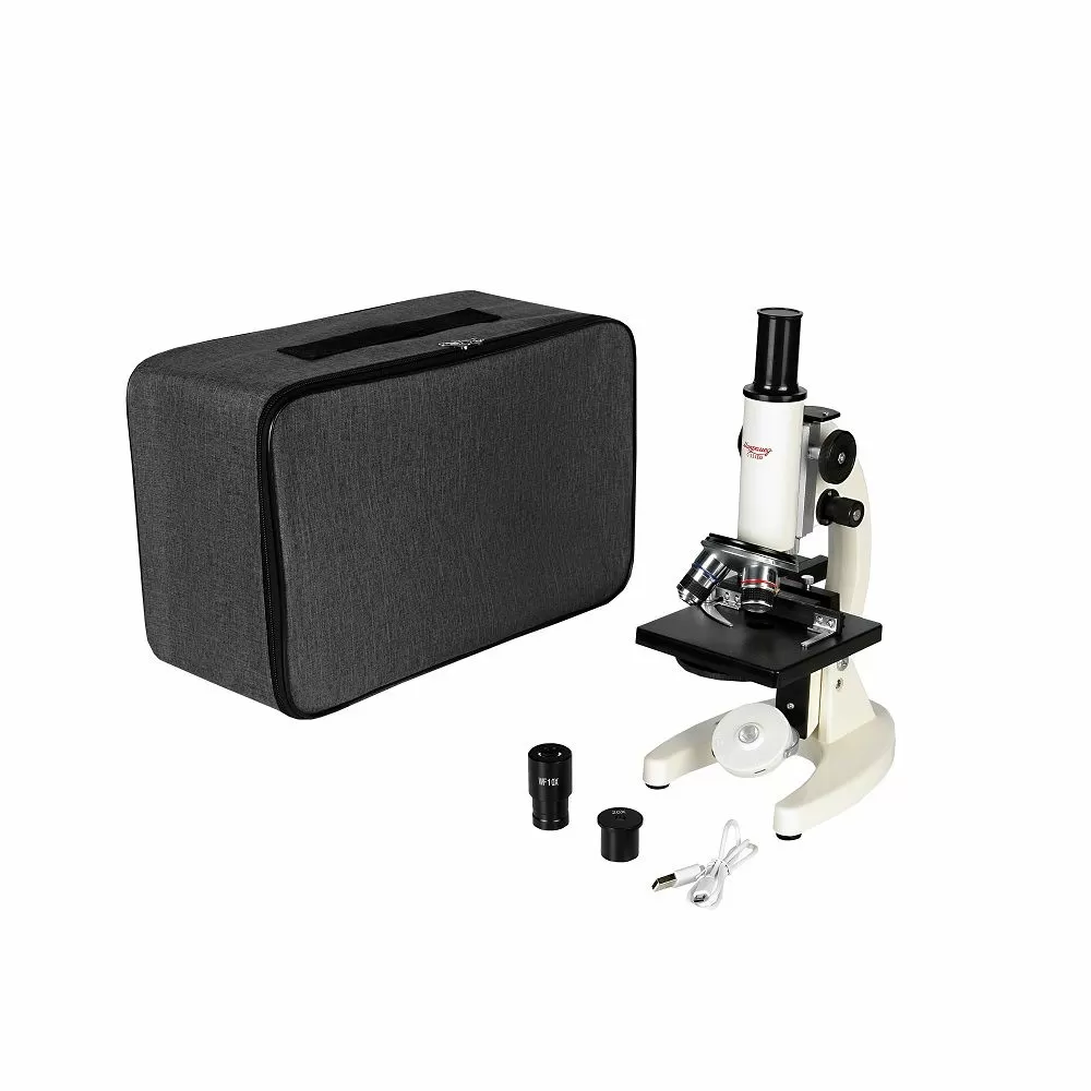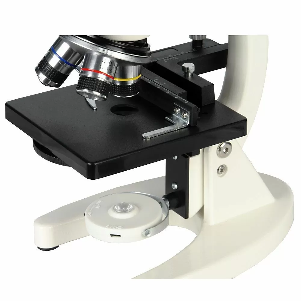 - Микроскоп предназначен для наблюдений в проходящем свете по методу светлого поля. Для освещения исследуемого препарата используется поворотное зеркало со светодиодной подсветкой от встроенного аккумулятора. Микроскоп оборудован предметным столиком с механическим держателем для точного перемещения препарата во взаимно – перпендикулярных направлениях. С помощью микроскопа можно изучать срезы тканей, мазки, прозрачные минералы, кристаллы и многое другое.