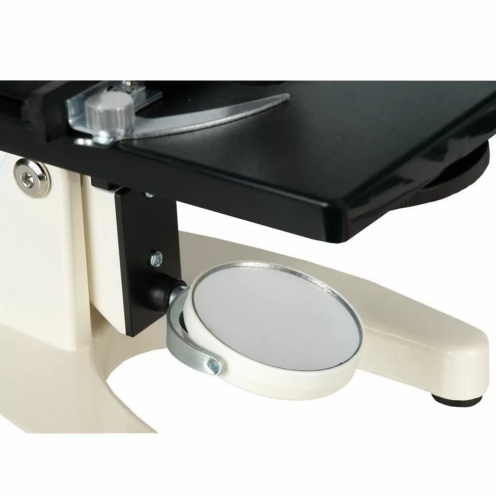 - Зеркальный осветитель микроскопа позволяет использовать в качестве источника света любой внешний источник – настольную лампу, фонарь, свет из окна или прямой солнечный свет. Для того, чтобы точно направить внешний свет на исследуемый образец, зеркало установлено на кронштейне, вращающимся в двух плоскостях.