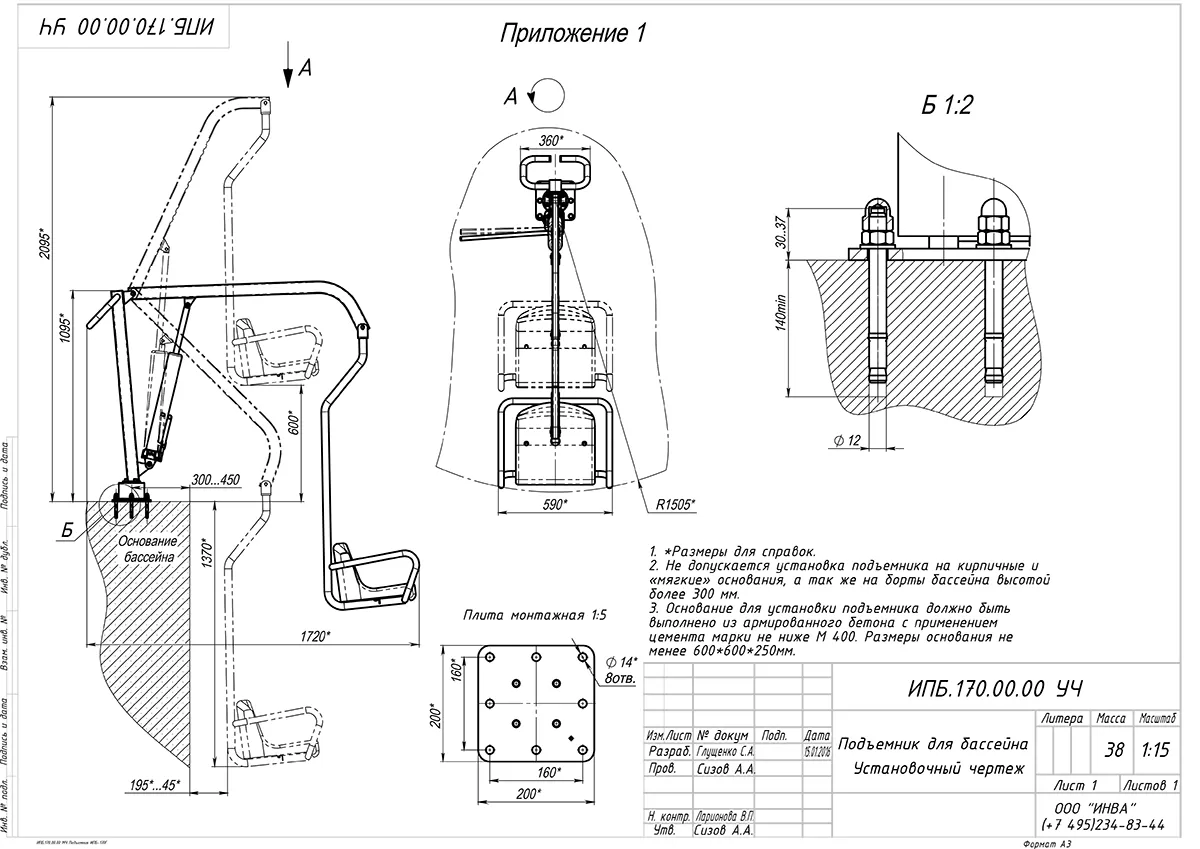 Небольшая площадь основания; удобный монтаж, не нарушающий целостности бассейна; материал, из которого выполнен подъемник для бассейна ИПБ-170 Г, - являются гарантом его длительного срока службы. Также в комплект поставки входит полный набор необходимых креплений.