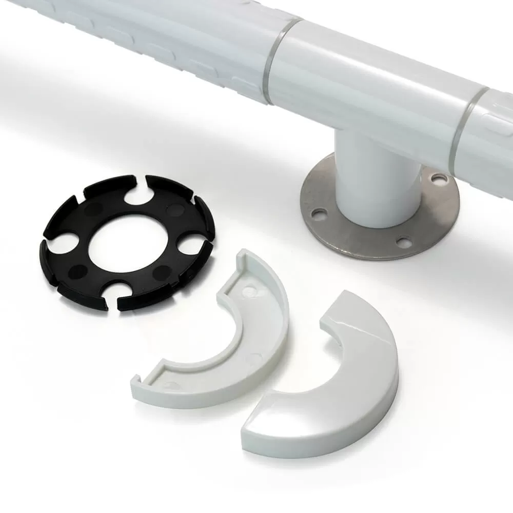 Кронштейны изделия вращаются вокруг своей оси, поэтому поручень может крепиться как на одной плоскости, так и в двух. Кроме того, универсальные соединительные элементы позволяют собирать различные конфигурации поручня – как угловую, так и прямые.