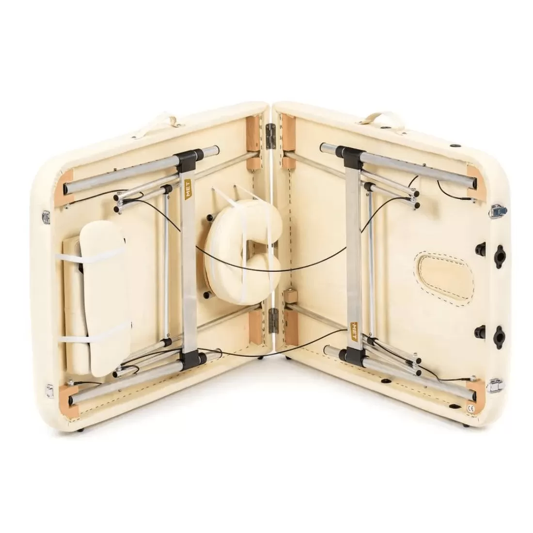- Массажный стол со складывающийся в чемодан рамой, выполненной из алюминия.