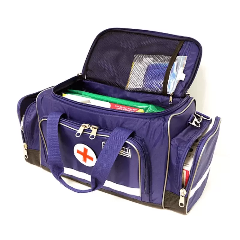 Для размещения вложений сумка имеет 3 кармана, основной отсек и отсек для хранения документов. На внешней части сумки расположен держатель для информационной таблички (для обозначения номера бригады и т.п.) и эмблема красного креста